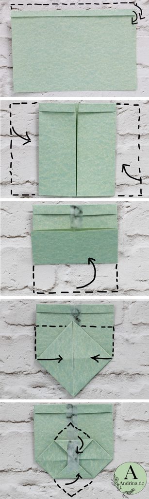 Blatt wenden: Drehe das Blatt um und falte die Seiten zur Mitte. Fixiere sie mit Tape.