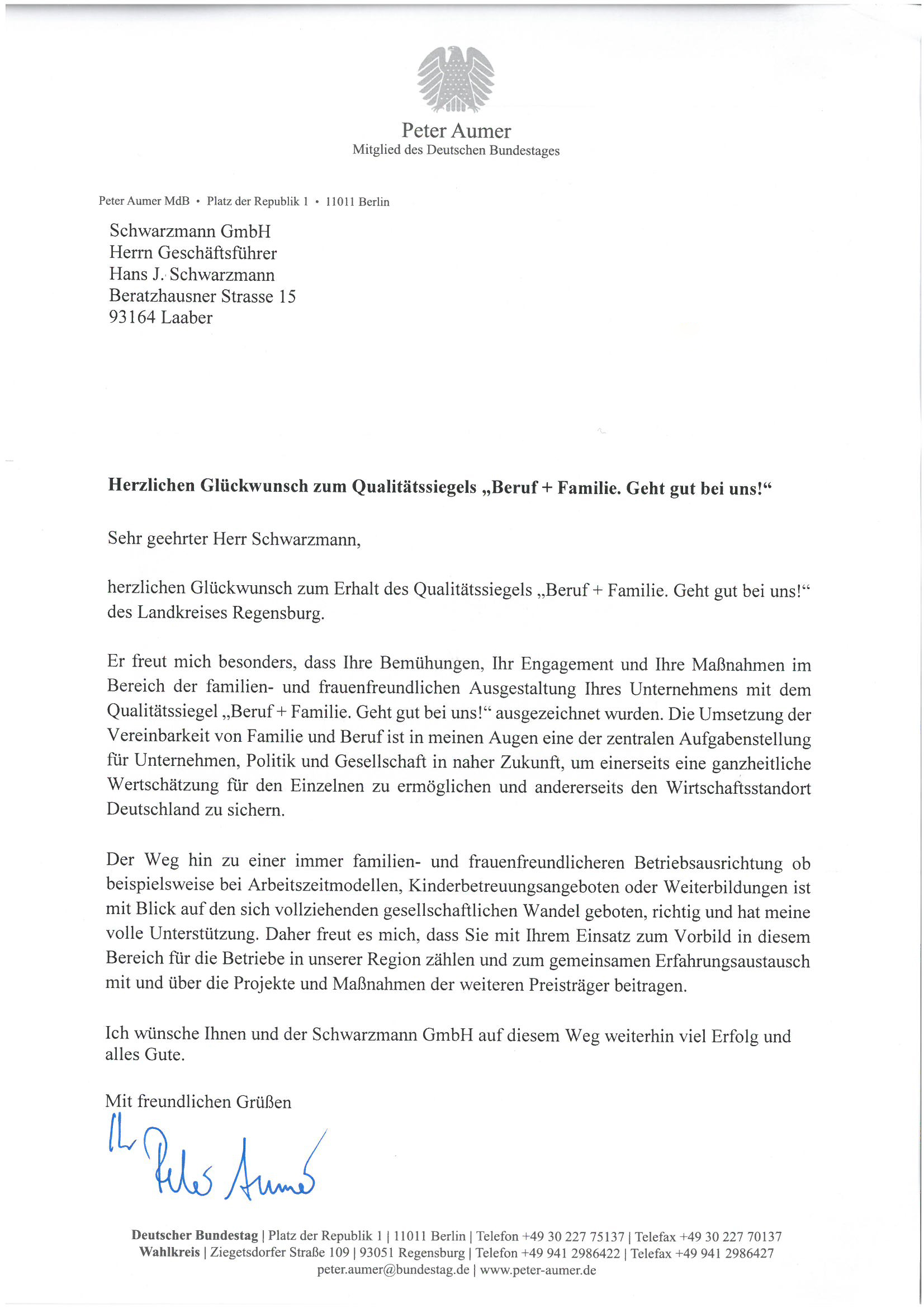 Seit 2017 gibt es die Auszeichnung „Beruf und Familie – Geht gut bei uns!“ vom Landkreis Regensburg, mit welcher familienfreundliche Firmen ausgezeichnet werden. 2015 startete die Landrätin Tanja Schweiger die Initiative mit dem Ziel frauen- und familienbewusste Personalpolitik in Unternehmen zu fördern. Im Abstand von zwei Jahren ruft der Landkreis Regensburg im Zuge dessen Betriebe dazu auf, ihre Maßnahmen vorzustellen und mit gutem Beispiel voran zu gehen. Grundvoraussetzung für die Auszeichnung ist eine familienbewusste Personalpolitik, welche durch beispielhafte Maßnahmen umgesetzt wird. Bewerben kann sich dafür jedes Unternehmen, unabhängig von der Betriebsgröße und der Branche.