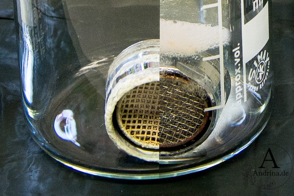 Je nach Konzentration sind nach ein paar Minuten oder über Nacht sind alle Kalkablagerungen aufgelöst. Feinsiebe oder Duschköpfe werden von allen Ablagerungen befreit.