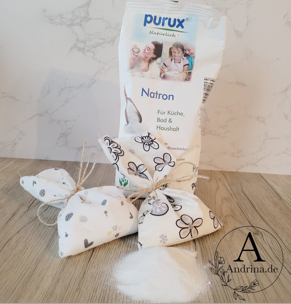 - Natron-Säckchen herstellen: Fülle etwas Natron in kleine Stoffsäckchen oder alte Socken. Ich habe hier einfach kleine Säckchen aus Baumwollstoff schnell selbst genäht!