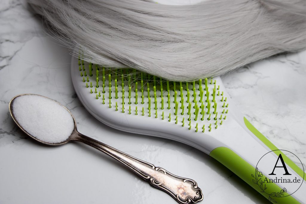 Menge: Je nach Haarlänge und Dicke 1–3 TL Natron mit 100–300 ml warmem Wasser vermischen.