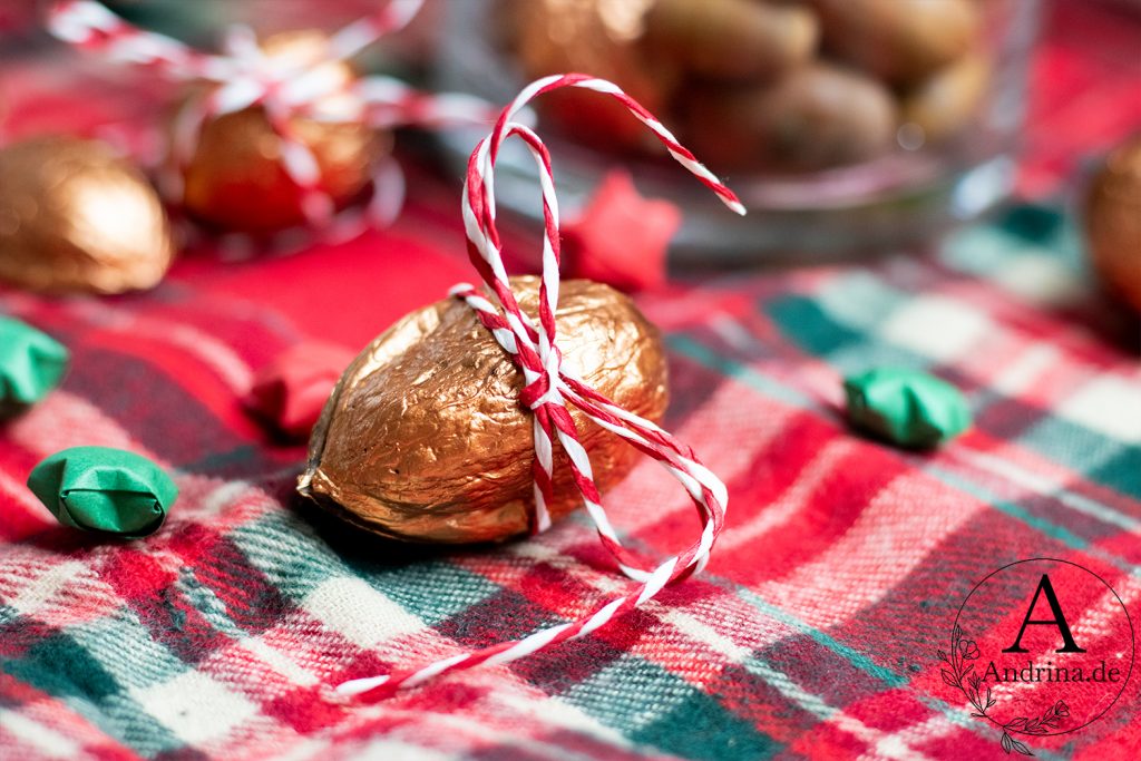 Für mich gehört zu Weihnachten auch Glanz und Glitzer einfach dazu. Deshalb habe ich mich dafür entschieden, bronzene Highlights in meine ansonsten natürliche Dekoration einzubauen. Wie bereits erwähnt, arbeite ich gerne mit Naturmaterialien. Diesmal habe ich ein paar Walnüsse, Walnusshälften und Eicheln genommen und sie mit Acrylfarbe bemalt. Die restlichen Früchte lasse ich in ihrem natürlichen Zustand.