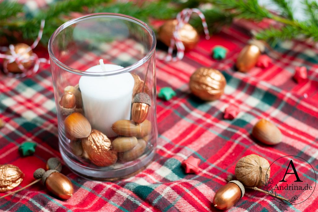 Wenn ihr Nüsse (oder etwas anderes) bemalt, bedenkt bitte, dass die Farbe etwas Zeit zum Trocknen braucht. Ihr solltet also am besten am Vortag anmalen/lackieren und erst am nächsten Tag damit dekorieren. Ihr könnt die Nüsse, Eicheln, etc. Jetzt einfach als Streudeko nutzen, oder ihr füllt ein Teelichtglas damit. Oben auf noch eine Kerze und es ist für mich perfekt. Im Nachhinein denke ich mir, dass eine Kordel um das Glas auch noch hübsch ausgesehen hätte.