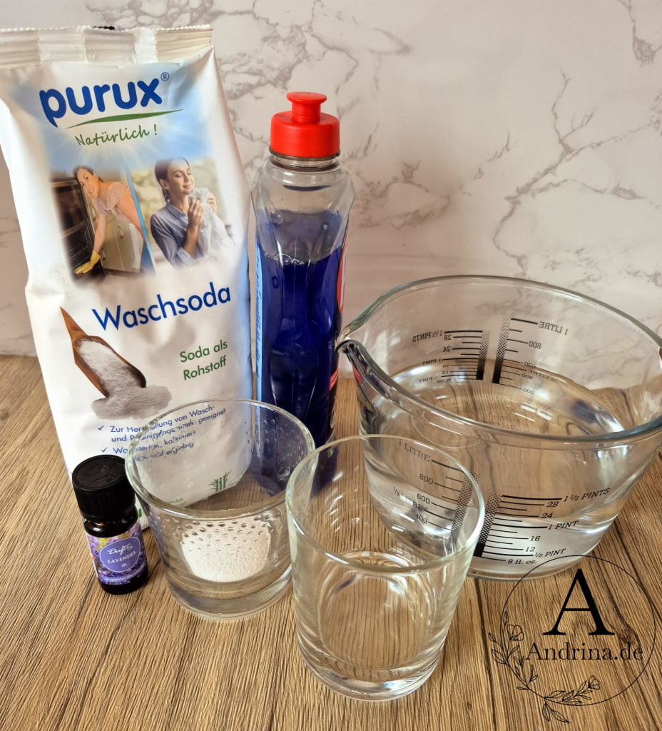 Dieser natürliche Allzweckreiniger entfernt Fett und Schmutz zuverlässig und duftet herrlich. Waschsoda, Essig und Spülmittel sorgen für effektive Reinigungskraft, während ätherische Öle für Frische sorgen.